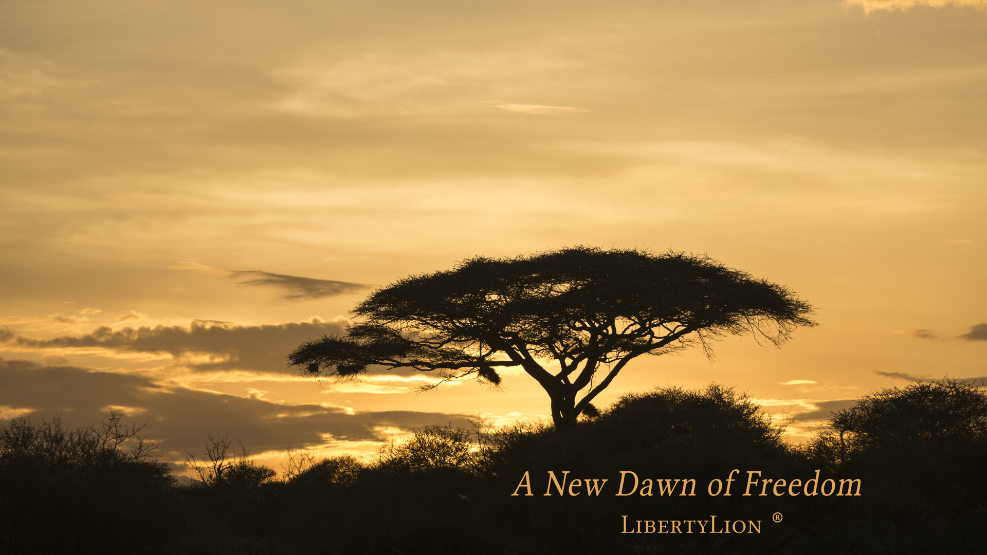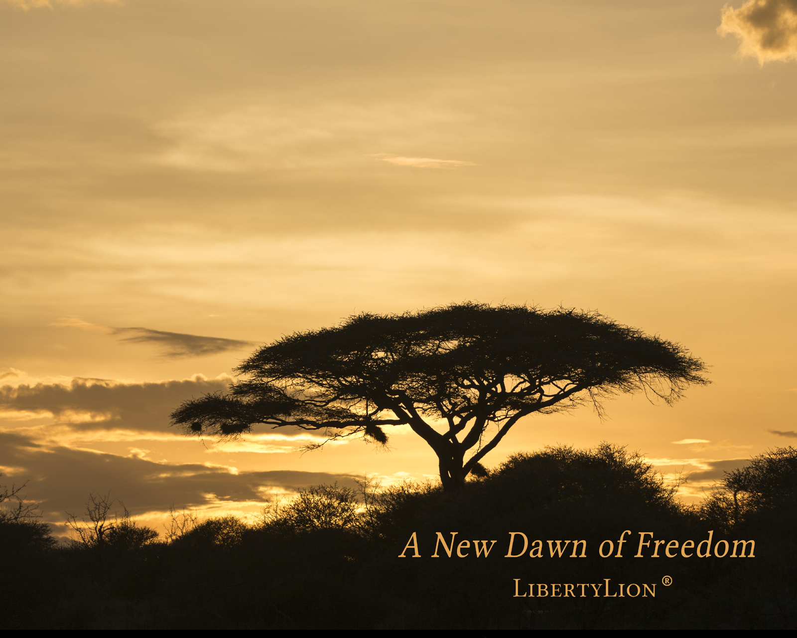 "A New Dawn of Freedom", featured on LibertyLion®'s home page, is a beautiful dawn in Africa. It was taken by Sarah Clark, a professional photographer. She has kindly allowed us to distribute her picture as LibertyLion® computer desktop wallpaper along with a high resolution version suitable for large format printing and framing so you can hang it on your wall to show your support of Freedom.